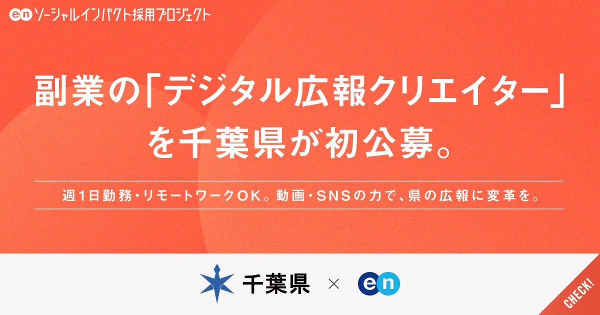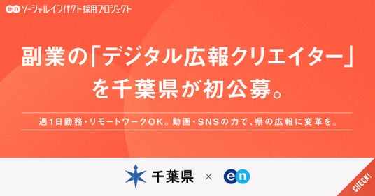 エン株式会社(本社:東京都新宿区、代表取締役会長兼社長:越智通勝)は、2026年2月13日(金)より、千葉県の『ソーシャルインパクト採用プロジェクト』(https://www.enjapan.com/)を開始しました。当社が運営する採用支援サービスを通じ、「デジタル広報クリエイター」の公募をサポートします。下記本プロジェクト概要と千葉県総務部人事課長 根本和紀氏のコメントを紹介します。