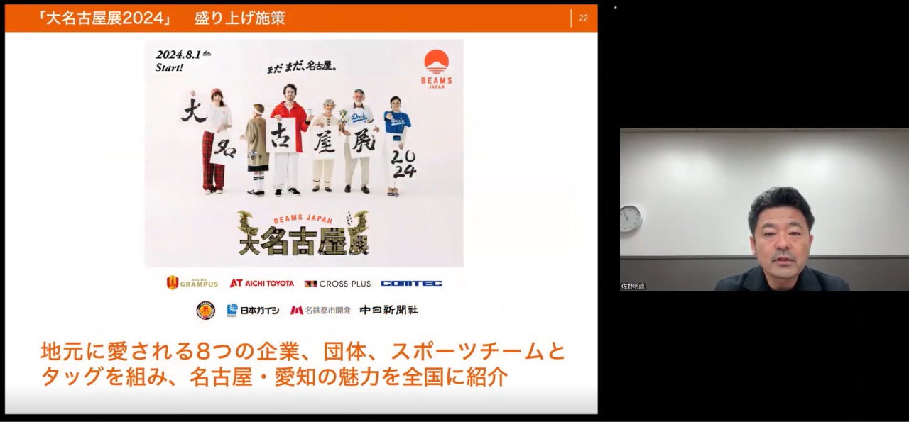 本イベントのゲストは、人気セレクトショップBEAMSが日本の魅力を発信する事業「BEAMS JAPAN」で地域プロデュースを手がける佐野明政氏。佐野氏は2000年にビームスに入社し、ショップスタッフやアウトレット事業の立ち上げを経験した後、地元である“名古屋・愛知”の知られざる魅力を発信するプロジェクト、「大名古屋展」を立ち上げます。第一部では、ご自身のこれまでの経歴や、BEAMSJAPANが目指すもの、そして「大名古屋展」を立ち上げるまでのストーリーをお話いただきました。