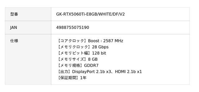 GK-RTX5060Ti-E8GB/WHITE/DF/V2 | 玄人志向 NVIDIA GeForce RTX 5060 Ti ホワイトカラー デュアルファン搭載 オーバークロック グラフィックボード