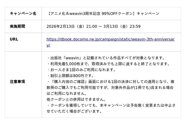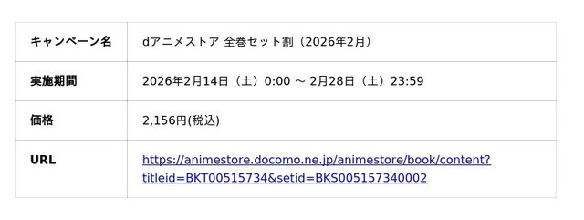 ドコモは、通信サービスにとどまらず、エンターテインメント領域を成長分野の一つと位置づけ、オリジナルコミックの創出からさまざまなメディアへの展開までを一気通貫で推進しています。これにあわせて、アニメ化決定を記念し、「dブック」および「dアニメストア」にて、原作コミックスをお得に楽しめる期間限定キャンペーンを実施いたします。キャンペーンに関する詳細はキャンペーンサイトおよび別紙をご確認ください。