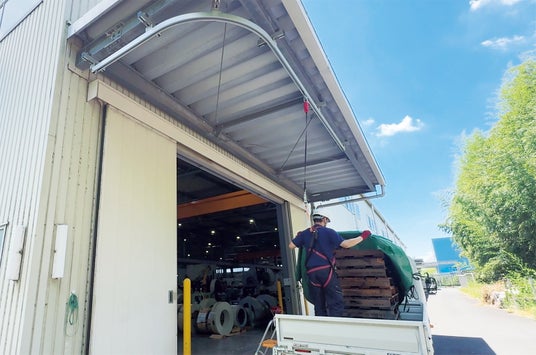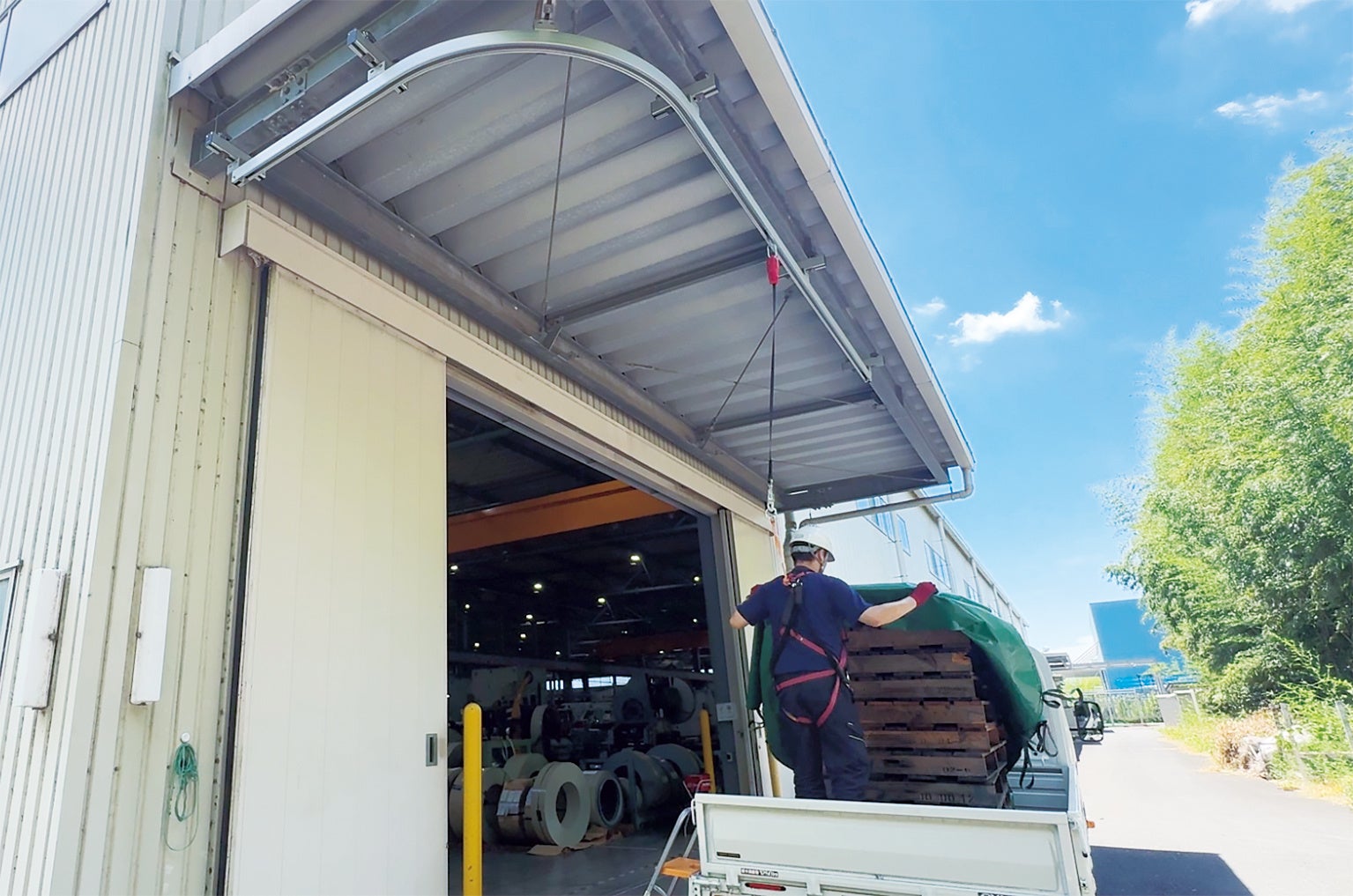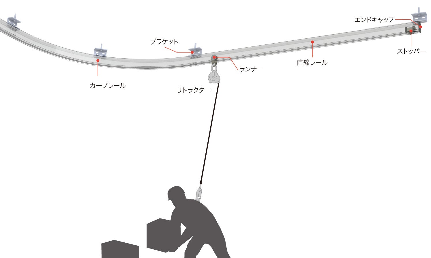 トラック荷役作業やトラック待機場、検車場・コンテナヤードなど、作業床のある2m以上の高所作業に最適な常設型の墜落防止装置(墜落制止装置)。倉庫等の天井面のH形鋼にレールを固定し、レール内にランナーが走行する仕組みです。作業者を墜落制止用器具(別売)で吊り下げながら、スムーズな移動を実現し、作業の省力化にも貢献します。
