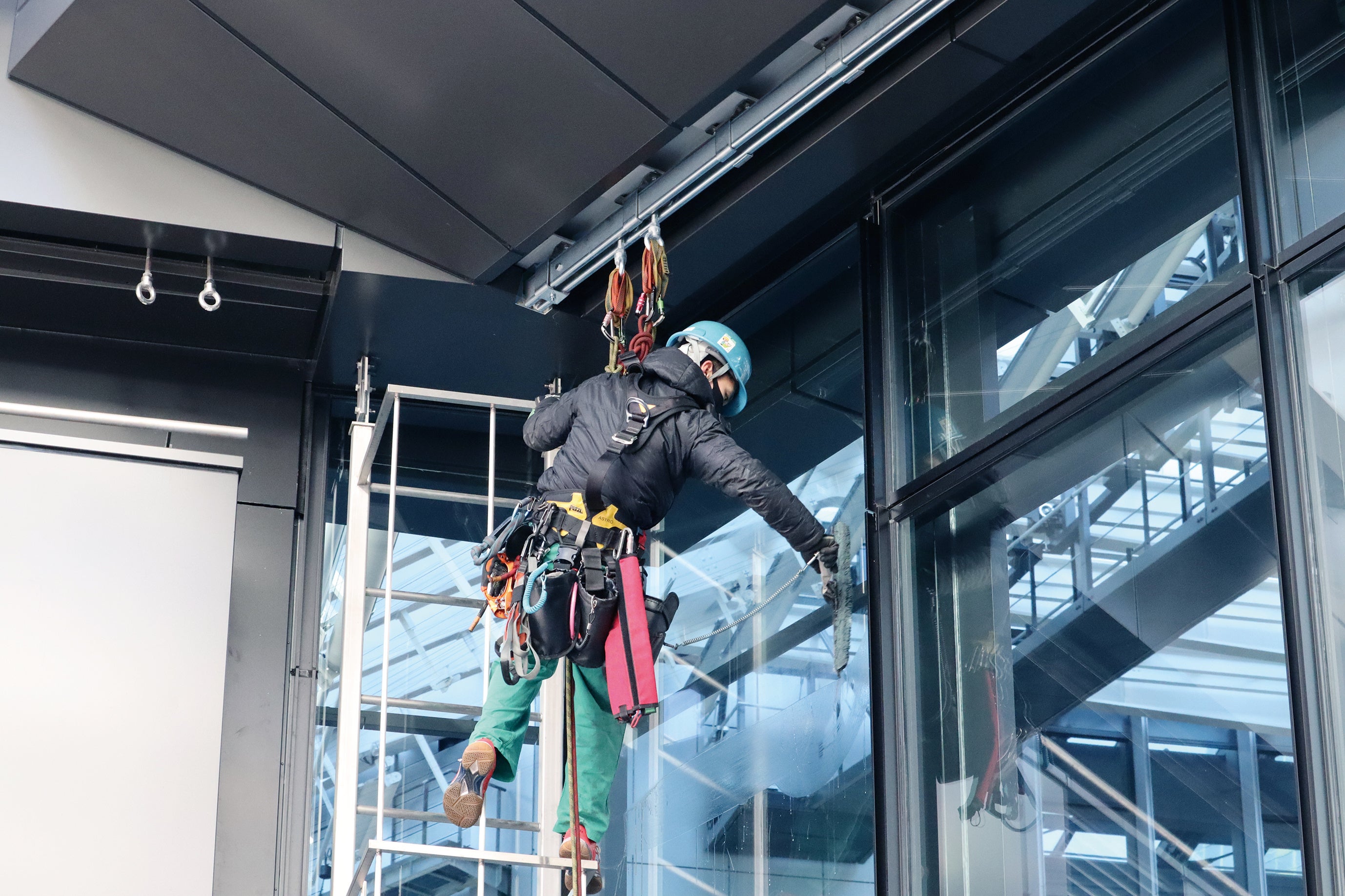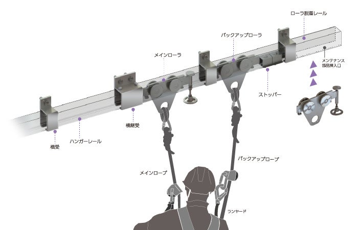 ビル清掃(窓ガラス清掃・外壁清掃など)、外壁調査など作業床の無い高所作業に最適な常設型の墜落防止装置(墜落制止装置)。作業者の命綱(安全帯)を吊り下げながらスムーズに移動することが可能です。