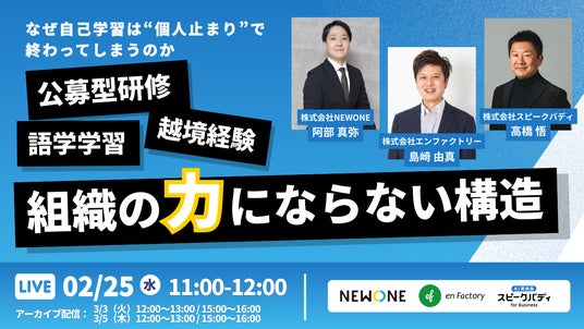株式会社エンファクトリー(東京都千代田区、代表取締役社長CEO加藤健太)は、2026年2月25日(水)11:00-12:00にて、『なぜ自己学習は“個人止まり”で終わってしまうのか ― 公募型研修・越境経験・語学学習が組織の力にならない構造』セミナーに登壇します。(詳細はこちら:https://sbbiz.jp/event/260225?organizationId=1780)