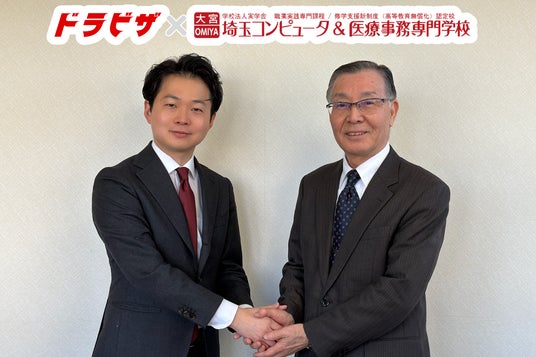 業務提携を締結した株式会社ドラビザ 代表取締役 羽田健太(左)と、学校法人実学舎 坂本健司理事長(右)。運送業界の安全性向上と定着支援に向けた「ドライバー専門教育カリキュラム」を、2026年4月より埼玉コンピュータ&医療事務専門学校にて開始する。