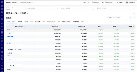 株式会社Picaro.AI(本社:横浜みなとみらい、以下 Picaro.AI)は、Amazonベンダーおよびセラー向け分析プラットフォーム「Picaro.AI」において、新たに検索キーワードレベルのコントリビューション比較分析機能の提供を開始しました。本機能により、全体KPIの変化を検索キーワード単位で分解し、それぞれがどれだけ寄与したかをbps(ベーシスポイント)ベースで可視化することが可能になります。
