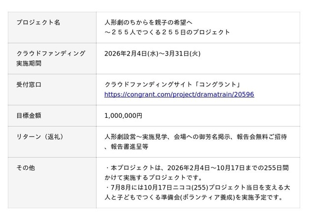 困窮家庭に育ち不安定なこども時代を過ごしたサバイバーの人形遣いたちが所属する人形劇団・NPO法人舞台アート工房・劇列車が、経済的な理由から体験の機会が限られている親子とともに無料の「人形劇アート体験」を実施するためのクラウドファンディングに挑戦しています。「体験格差をなくしたい」という思いで、当該親子たちを255人の輪で支え、10月17日までに255日間かけて行います。目標金額は100万円です。