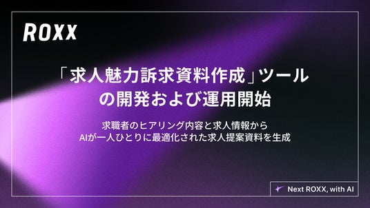未経験から正社員を目指すノンデスク領域に特化した転職プラットフォーム『Zキャリア』を運営する株式会社ROXX(本社:東京都新宿区、代表取締役社長:中嶋汰朗、東証グロース:241A、以下 ROXX)は、求職者のヒアリング内容と求人情報を掛け合わせ、AIが求職者一人ひとりに最適化した求人提案資料を生成する「求人魅力訴求資料作成」ツールを開発し、本格的な運用を開始いたしましたのでお知らせいたします。