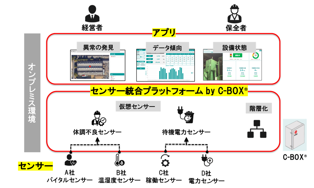 センサー統合プラットフォームは、複数のセンサーと組み合わせた制御装置「C‐BOX(R)」から構成され、設備の状況や人の動作をモニターを通じて可視化する仕組みです。