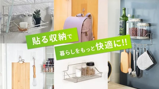 透明の特殊ステッカーで壁面に貼り付けるフック・ラック型の製品で、キッチンや洗面所、玄関など多様な生活シーンで、さまざまな日用品の壁面活用が可能です。