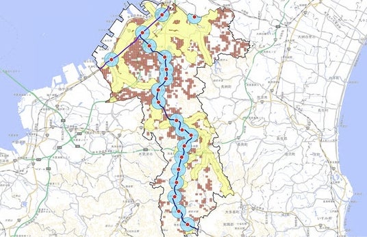 想定浸水区域や鉄道路線などの必要情報をQGIS上で準備。Kumoyを通せば、Web開発なしで簡易的なハザードマップの作成も可能です。
