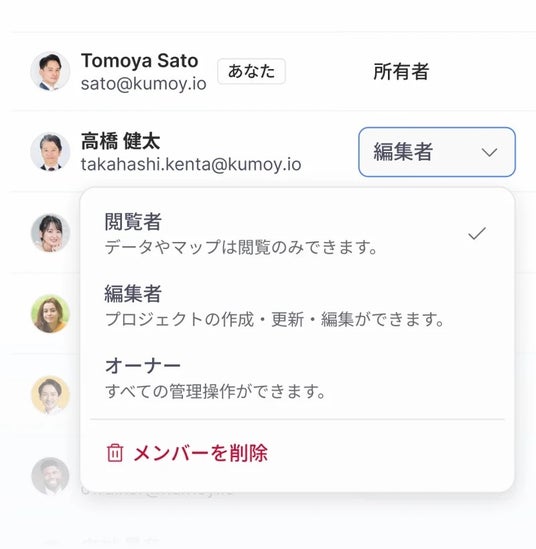 組織・プロジェクト内のアクセス権限と更新管理が可能になります。権限管理・メンバー管理をWeb上で一元化し、データの更新状況をリアルタイムで共有します。作業の進行が可視化され、作業効率が大幅な向上が期待できます。