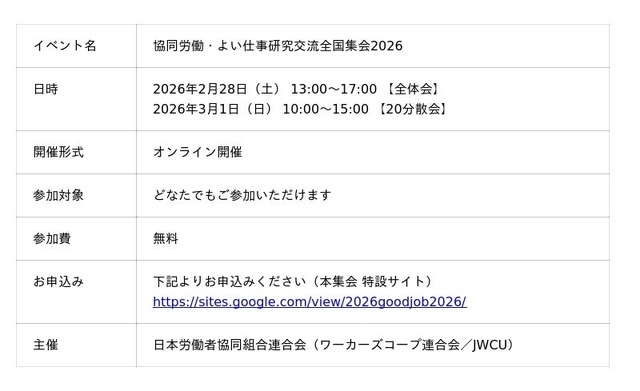 ワーカーズコープ連合会では、2026年2月28日(土)と3月1日(日)に、「協同労働・よい仕事研究交流全国集会2026」をオンラインで開催します。本集会は、「協同労働によって実現する(実現したい)よい仕事とは何か」を実践者同士や研究者で学び合い、研修・交流を通じて深めていくことを目的としています。