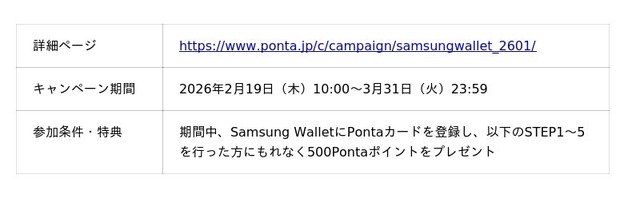 今回のサービスアップデートを記念し、2026年2月19日(木)~3月31日(火)の期間中、Samsung WalletにPontaカードを追加した方にもれなく500Pontaポイントをプレゼントします。