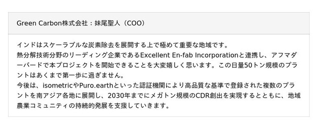 本プロジェクトは、高い信頼性を持つ炭素市場への提供を目的として開発されており、科学的厳密性と透明性の高いdMRV(デジタルによる測定・報告・検証)を実現するisometricスタンダードに準拠しています。本プラントは2026年第2四半期の商業運転開始を予定しており、Green Carbonの中長期戦略における重要な中核事業の1つです。同社のポートフォリオには、インド、ベトナム、タイにおける追加バイオ炭プラントの建設計画や、ナグプールでのバイオリファイナリー(※5)事業も含まれています。こうしたモジュール型かつ拡張可能な事業モデルは、迅速な展開を可能とする設計となっており、2030年までに南アジア全域で年間30万トン(tCO2e)の炭素除去を実現するという同社の目標達成を後押しするものです。◆ 関係者コメント