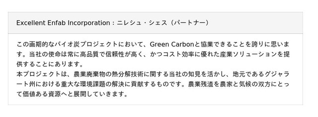 ネイチャーベースのカーボンクレジット創出・販売事業を展開するGreen Carbon株式会社(代表取締役:大北潤、以下Green Carbon(グリーンカーボン))は、インド・アーメダバードを拠点とし、豊富な実績を持つバイオ炭プラントメーカーExcellent Enfab Incorporation(パートナー:Nilesh Sheth、以下「Excellent Enfab」)との提携を発表しました。本提携により、インドのグジャラート州および西ベンガル州において、新たなバイオ炭カーボン除去(BCR)プロジェクト(以下「本プロジェクト)を開始します。
