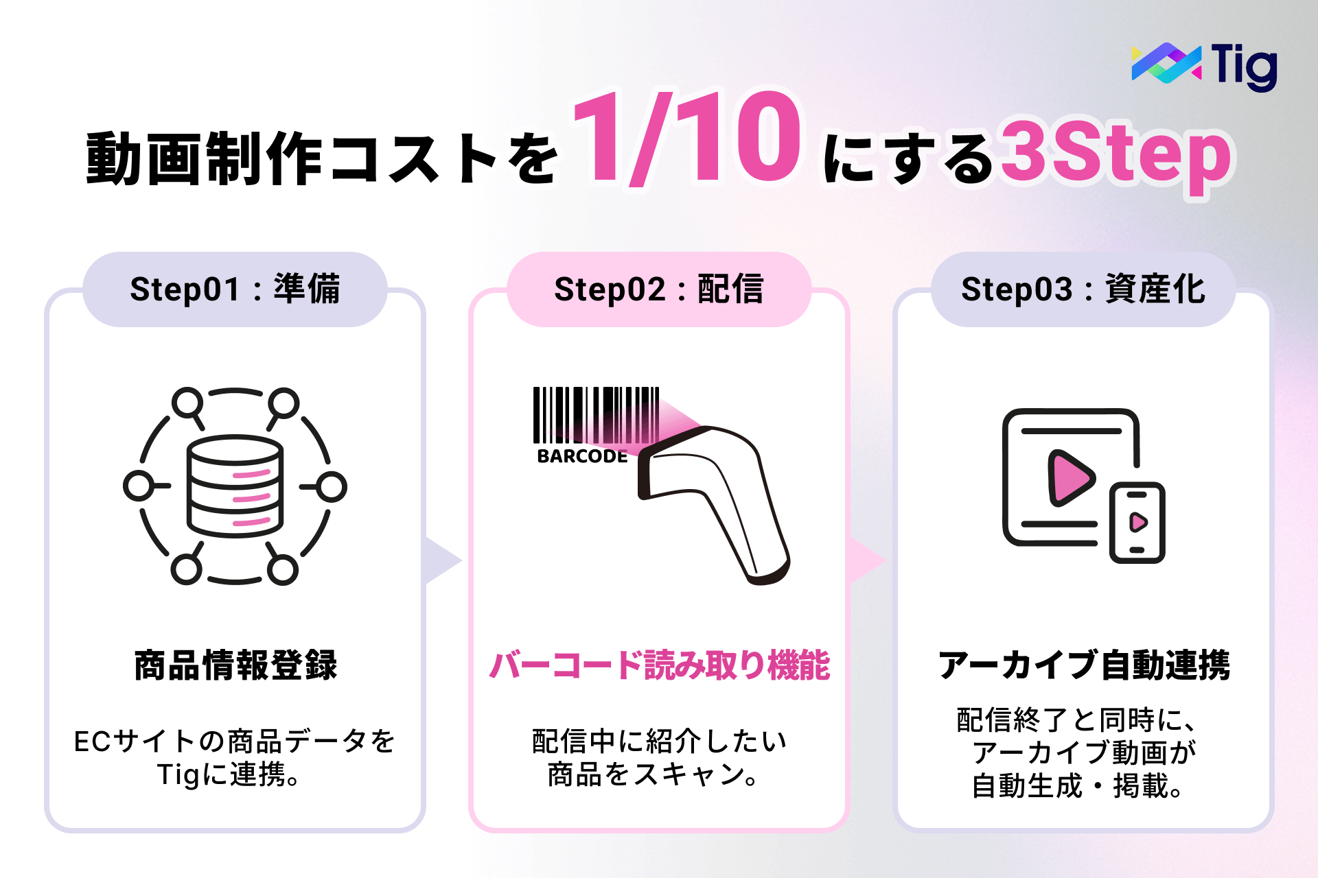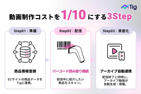 Tig LIVEの自動化ソリューションを活用すれば、以下の3ステップだけで「資産型動画」の構築が完了します 。