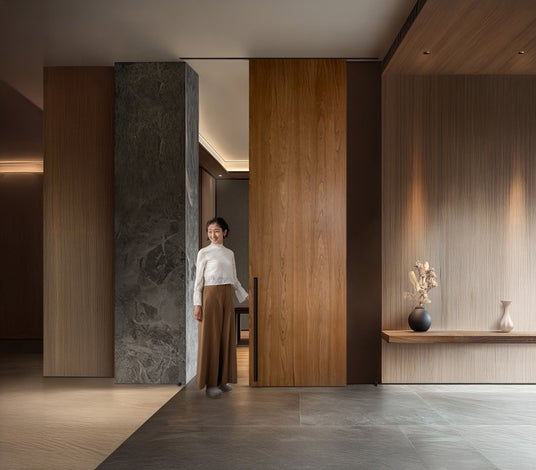 内開きでも廊下側の壁面をフラットに揃えられ、壁と完全に一体化