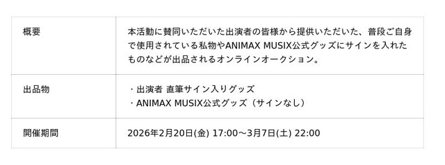 オークションの売上は、クリエイター支援のため2026年開催予定のANIAMX MUSIX NEXTAGE運営費およびNPO法人アニメーター支援機構への寄付に充てさせていただきます。