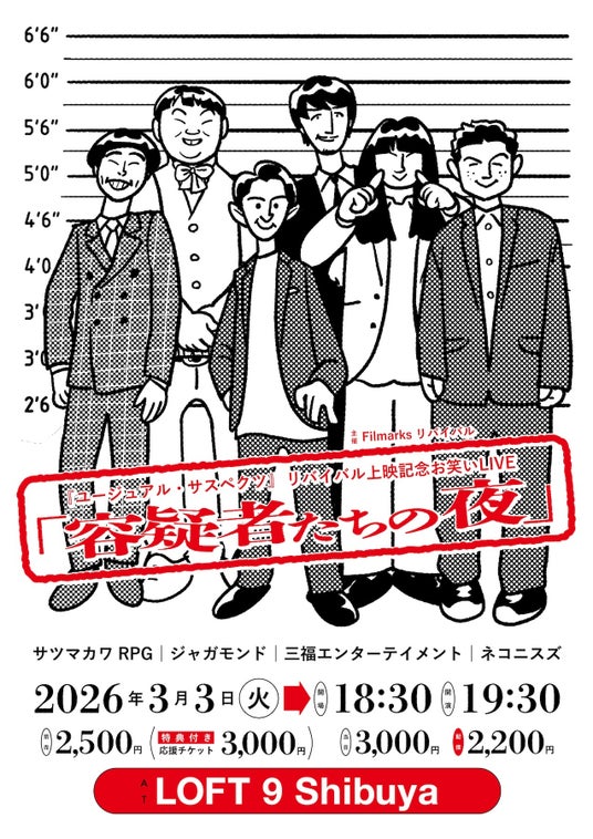 なお、上映3日前となる3月3日(火)には、ジャガモンド斉藤さんもご出演の、『ユージュアル・サスペクツ』の魅力を笑って楽しめる、一夜限りの映画×お笑いクロスカルチャーイベント「『ユージュアル・サスペクツ』公開記念お笑いLIVE【容疑者たちの夜】」の開催も決定!