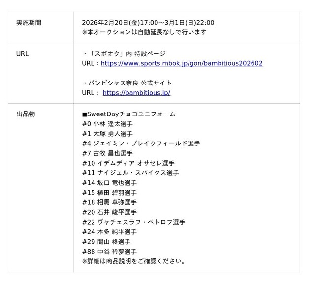 【バンビシャス奈良 SweetDayチョコユニ 選手着用ユニフォームオークション 概要】