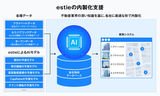 estieは、各社のデータとノウハウを外部に出さず、企業の中のセキュアな環境でAIを構築・運用する「内製化」に徹底的にこだわります。estieにしか集約できない不動産データ、不動産業界特有の商習慣や意思決定プロセスへの深い理解を、企業ごとに最適な形で提供することで、「自社のためだけのAI」を育てる能力そのものを支援します。<強固なセキュリティ環境のもと、不動産×AIにより業務を高度化>