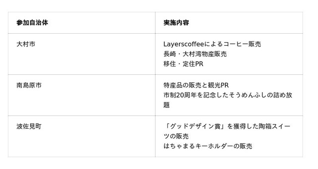 【参加自治体・団体】大村市、南島原市、波佐見町、ベーグルまるこや、株式会社ピエクレックス