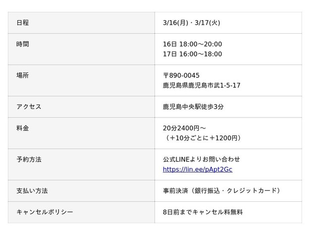 占い師養成CAMPの説明会と同時に、くるとん先生の対面鑑定も鹿児島で行います。すでにご予約いただきました方、誠にありがとうございます。くるとん先生が鹿児島で鑑定される貴重な機会になりますので、奮ってご参加ください。