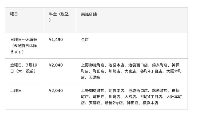 ・上野御徒町店、池袋本店、池袋西口店、錦糸町店、神保町店、町田店、川崎店、大宮店、谷町4丁目店、大阪本町店、天満店は¥1,930(税込)で金曜、土曜、祝前日も開催します