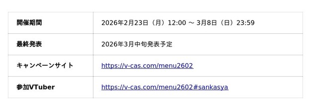 「All for Streamers」をコンセプトに、YouTube・Twitch・Mirrativなど各配信プラットフォームで活動する配信者(VTuber/ストリーマーなど)を支援する株式会社ミラティブのグループ会社、株式会社アイブレイド(本社:東京都豊島区 代表取締役:妻木 泰夫)が運営するVTuberキャスティングサービス「ぶいきゃす」(https://v-cas.com/ )は、menu株式会社(本社:東京都新宿区、代表取締役:信田篤男)が運営するデリバリーアプリ「menu」との初のコラボイベント「ぶいきゃすmenuキャンペーン」を、2026年2月23日(月)から開催したことをお知らせします。