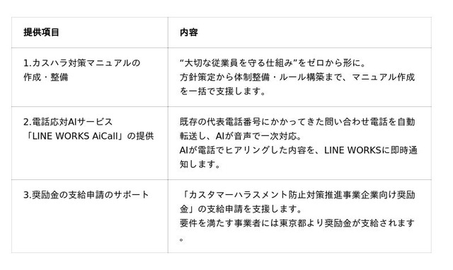 このたび、LINE WORKSおよびJWCRは、このような課題を抱える事業者のカスハラ対策を、コスト負担を抑えて支援すべく、両社が保有する実効性の高いソリューションを組み合わせた「中小企業向けカスハラ対策パッケージ」を開発しました。