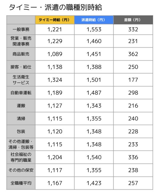 全職種平均で見ると、派遣求人の時給は1,423円、タイミーは1,167円と、派遣の方が257円高くなっています。自由度や気軽さよりも、時給を重視する求職者にとっては、現時点では派遣求人の方がより魅力的な選択肢であることがうかがえます。