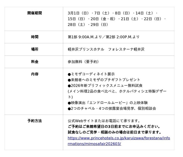 ご来館いただいたカップルの皆さまには、本フェア限定のミモザのプチギフトもプレゼントいたします。軽井沢のやわらかな春の空気とともに、料理・装飾・演出を一度に体験いただける特別なひとときを提供いたします。