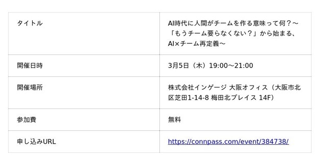 コミュニケーションプラットフォーム「Re:lation(リレーション)」を提供し、6,000社以上(※1)の導入実績を誇る株式会社インゲージ(本社:大阪府大阪市、代表取締役社長:和田 哲也)は、2026年3月5日(木)に開催される技術コミュニティイベント『AI時代に人間がチームを作る意味って何?~「もうチーム要らなくない?」から始まる、AI×チーム再定義~』の会場として、大阪本社オフィスを提供することをお知らせいたします。