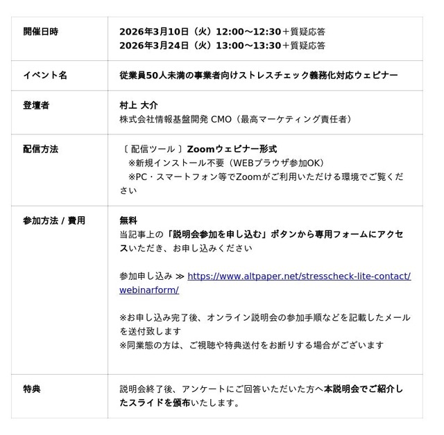ストレスチェック制度開始時よりサービス提供してきた株式会社情報基盤開発(本社:東京都文京区、代表取締役:鎌田長明)は、法改正に伴う「ストレスチェック実施の全事業場義務化」準備に向けた、従業員50人未満の事業場・法人組織・団体を対象とするオンライン説明会を3月10日(火)・3月24日(火)に開催いたします。