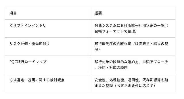 本サービスでは、以下を含む「PQC移行方針書」を作成します。