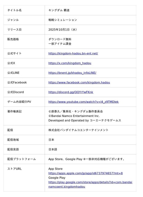 「キングダム 覇道」は、バンダイナムコエンターテインメントがコーエーテクモゲームスと共に開発している戦略シミュレーションゲームです。