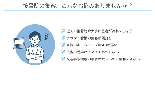 現在、多くの整骨院・接骨院様から以下のようなご相談をいただいています。