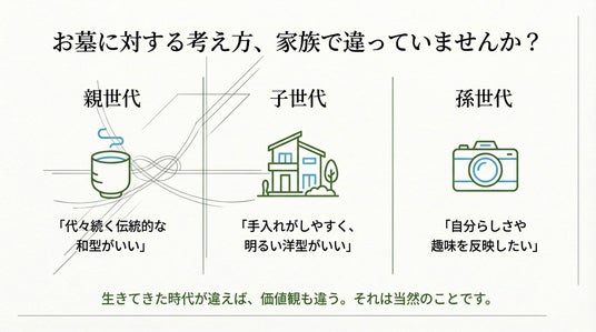 生きてきた時代が違えば、価値観も違う。それは当然のことです 。親世代は「代々続く伝統的な和型」、子世代は「手入れがしやすく、明るい洋型」、孫世代は「自分らしさや趣味を反映したい」など、お墓に対する考え方は家族で違っていることが少なくありません 。