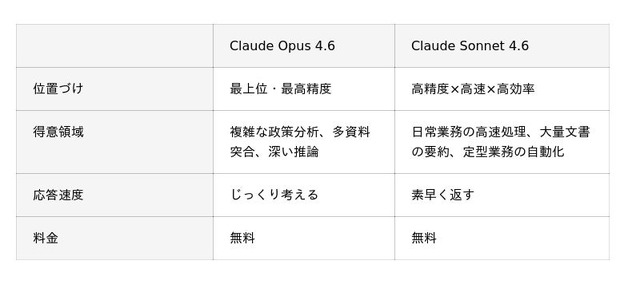 行政現場のリアルは、「毎日の問い合わせ対応や文書作成」がSonnet、「計画書の突合や政策の深堀り」がOpusという使い分けです。QommonsAIは両方を無料で使い放題にすることで、職員の方々がモデル選択で迷わない環境を実現します。