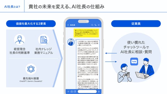 「AI社長」は、汎用AIによる没個性化の危機から企業の「会社らしさ」を守る、企業オリジナルのAIチャットサービスです。