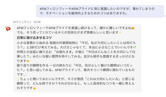 「AIマニュマニュ」は、株式会社THAが提供するカスタムAIサービス「AI社長」の仕組みを活用し、AFMフィロソフィーとAFMプライドを従業員の皆さんにもっと身近に感じてもらうためのアンバサダーキャラクターAIです。