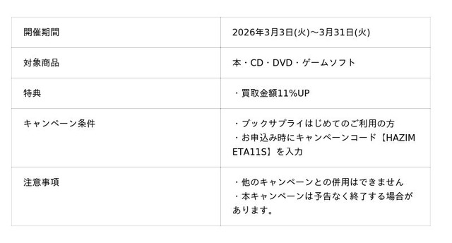 株式会社ブックサプライ(本社:大阪府吹田市、代表取締役:藪田真吾)は、はじめて同社の宅配買取サービスを利用する方を対象に、買取金額が11%アップとなる初回限定キャンペーンを2026年3月3日(火)~3月31日(火)の期間限定で開催します。