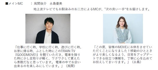 24年4月に開局したTRAIN TVは、料理、グルメ、ドラマ、バラエティなど様々なジャンルの番組を放映し、電車内で番組コンテンツを見るという新体験を都市生活者に提供してまいりました。開局以来、多くの乗客に慣れ親しまれてきたTRAIN TVは3年目を迎える26年4月、新たに策定したブランドコンセプトのもと再スタートを切ります。同時に新情報番組『都市型情報ナビゲーター GOODMOVE!』の放映を開始し、オーディエンスの大半を占める働く都市生活者に寄り添った情報提供を行います。