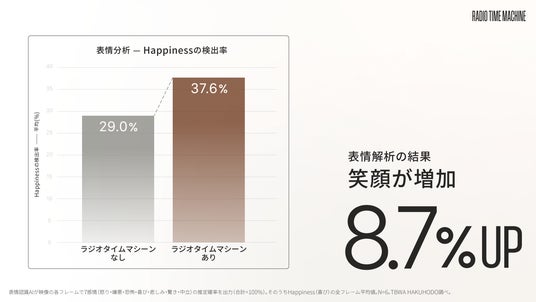 1. 表情解析を行ったところ、過去を振り返り当時の思い出に浸ることで、笑顔の値(口角の角度や頬の挙上を検出)が平均として8.7%上昇するという結果が得られました。中には、ラジオを聴くことで、23.8%値が上昇した利用者もいるなど、笑顔が増えました。