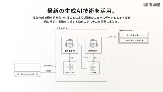 音声コンテンツで流れる過去の出来事は、独自に作成したニューストピックリストに基づいています。ニューストピックリストを作成する上では、Wikipediaに掲載されている過去の出来事を参照しており、各年のニューストピックリストをもとに生成AIが当時のラジオ番組を模したニュース原稿を自動生成します。その原稿を、AIボイスが当時のラジオ番組風に読み上げることで、まるで過去のラジオパーソナリティがその日の出来事を紹介しているかのような音声コンテンツが生成されます。またヒット曲については、当時の流行などを反映した独自のヒット曲リストを作成し、デジタル配信用の音源データをニュースの合間に再生。これにより、ラジオ番組のような構成の音声コンテンツが完成します。