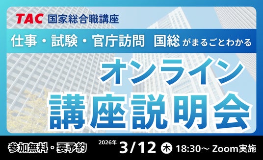 資格の学校TAC(東京都千代田区、代表取締役社長:多田 敏男)は、国家総合職(官僚)試験対策として、無料オンライン講座説明会「新試験制度にもバッチリ対応!国総がまるごとわかる講座説明会」を2026年3月12日(木)にZoom配信にて開催いたします。