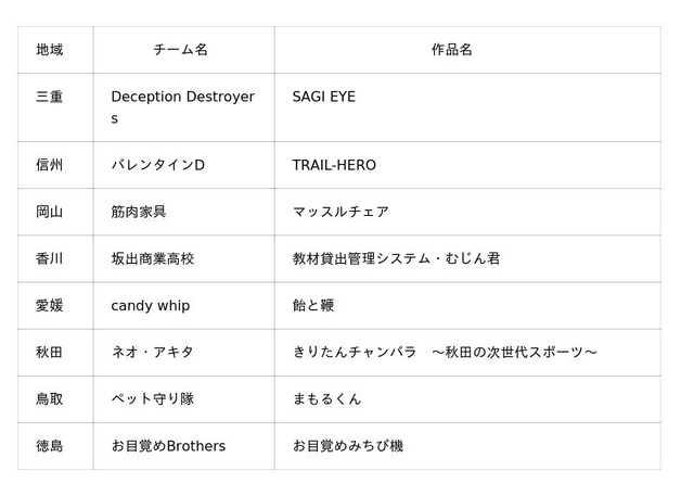 今回の全国大会では、2025 年度 (2025 年 4 月 ~ 2026 年 3 月)に、Web×IoT メイカーズチャレンジ PLUS のハッカソンを開催した秋田・信州・三重・鳥取・岡山・徳島・香川・愛媛から代表チームが集まり、計 8 チームがハッカソンで制作した作品のプレゼンテーションを行います。発表後には、審査員投票と当日のオンライン見学者による人気投票により今年度のグランプリ作品を決定し、グランプリ受賞したチームには、総務省より国際戦略局長賞が授与される予定です。