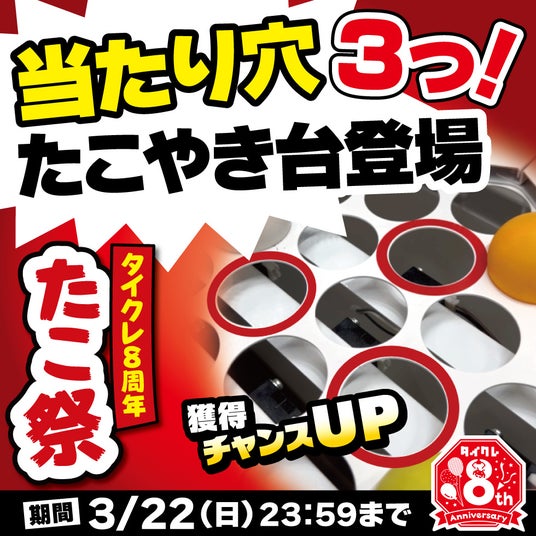 8周年記念キャンペーン第2弾となる3月は、日頃のご愛顧への感謝を込めて、そして皆様のご多幸を祈念して、8本足の“たこ”にあやかった、多幸感たっぷりの「タイクレたこ祭」を開催いたします。遊べば遊ぶほど福が来る!?にぎやかでおめでたいお祭りをどうぞお楽しみください。