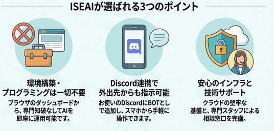 ISEAIは、この障壁を解消し、専門知識がなくてもAIエージェントを即座に業務へ導入できるマネージドサービスとして開発されました。