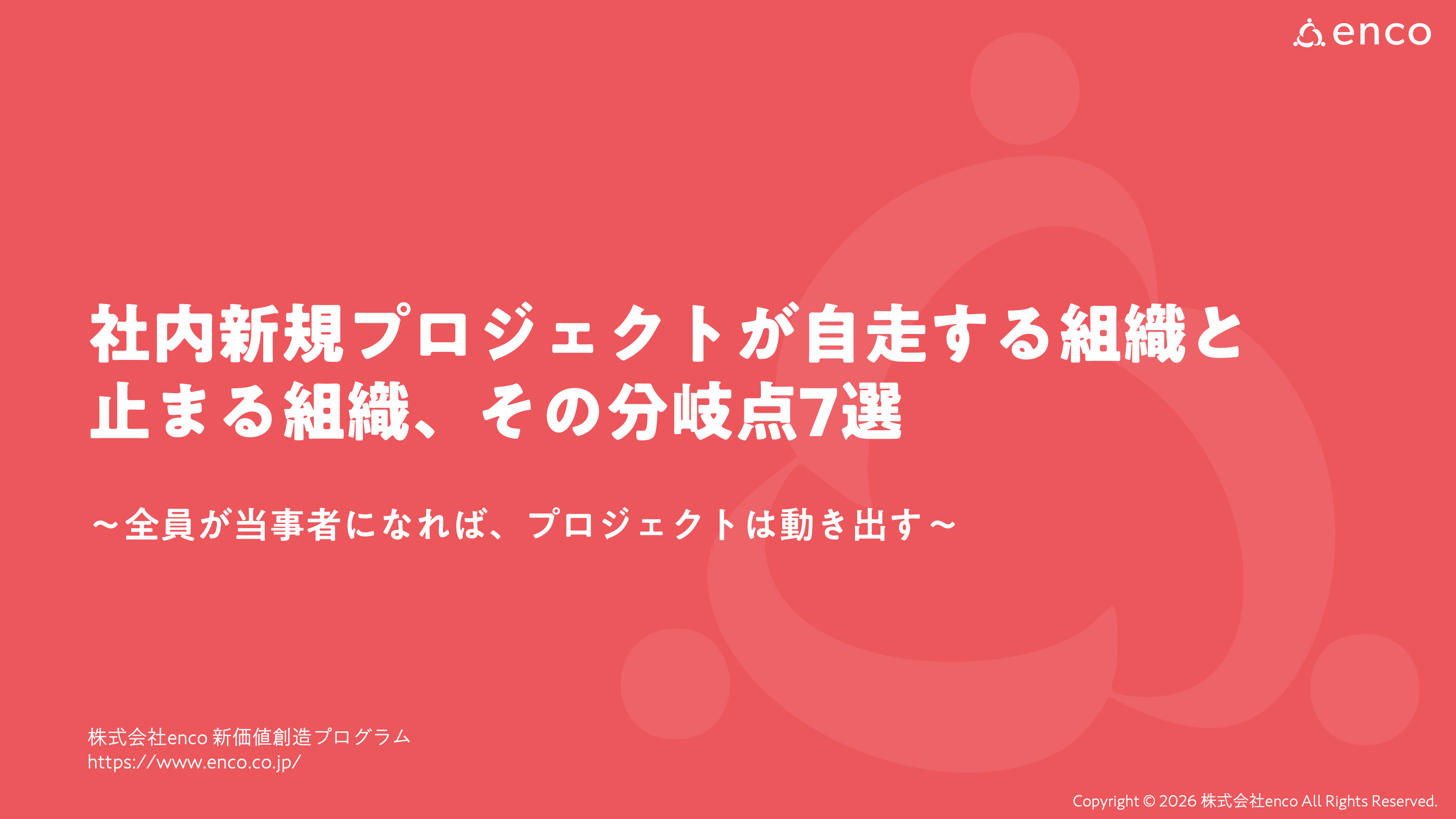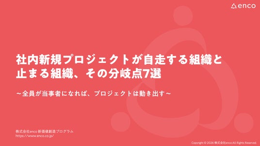 新規事業の探索やDX推進など、多くの企業が社内プロジェクトを立ち上げる一方で、立ち上げから半年以内に推進力を失うケースが後を絶たない中、「自分ごと化」を軸にした人材育成・組織開発を展開する株式会社enco(本社:愛知県名古屋市、代表取締役:小林延光、以下「enco」)は、ホワイトペーパー『社内新規プロジェクトが自走する組織と止まる組織、その分岐点7選』を本日公開いたしました。